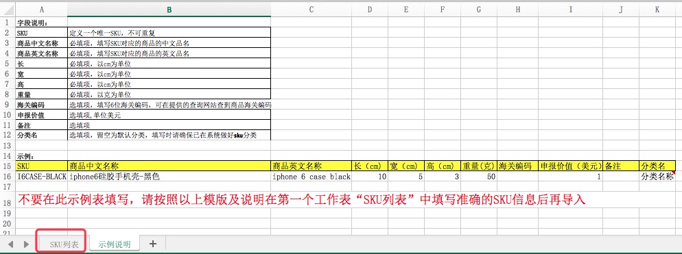 进入SKU列表菜单,点击“批量导入”按钮,首先下载导入的模板,根据模板说明,在excel第一个工作表“SKU列表”中输入要导入的SKU数据。