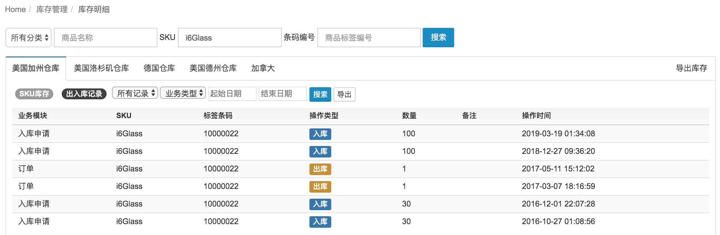 可以查看每一个SKU的出入库记录,可按业务类型,操作类型,时间等检索查看