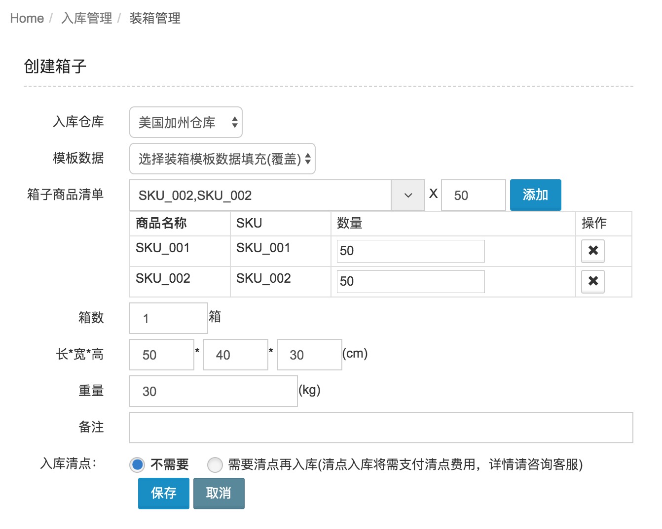 如果有常用的固定的SKU装箱,你可以做装箱模板预设,这样在建立装箱时选择模板可快速创建装箱信息。