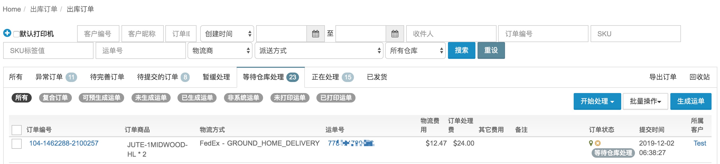 在出库订单中“等待仓库处理”的列表中为仓库每天需要处理的订单。