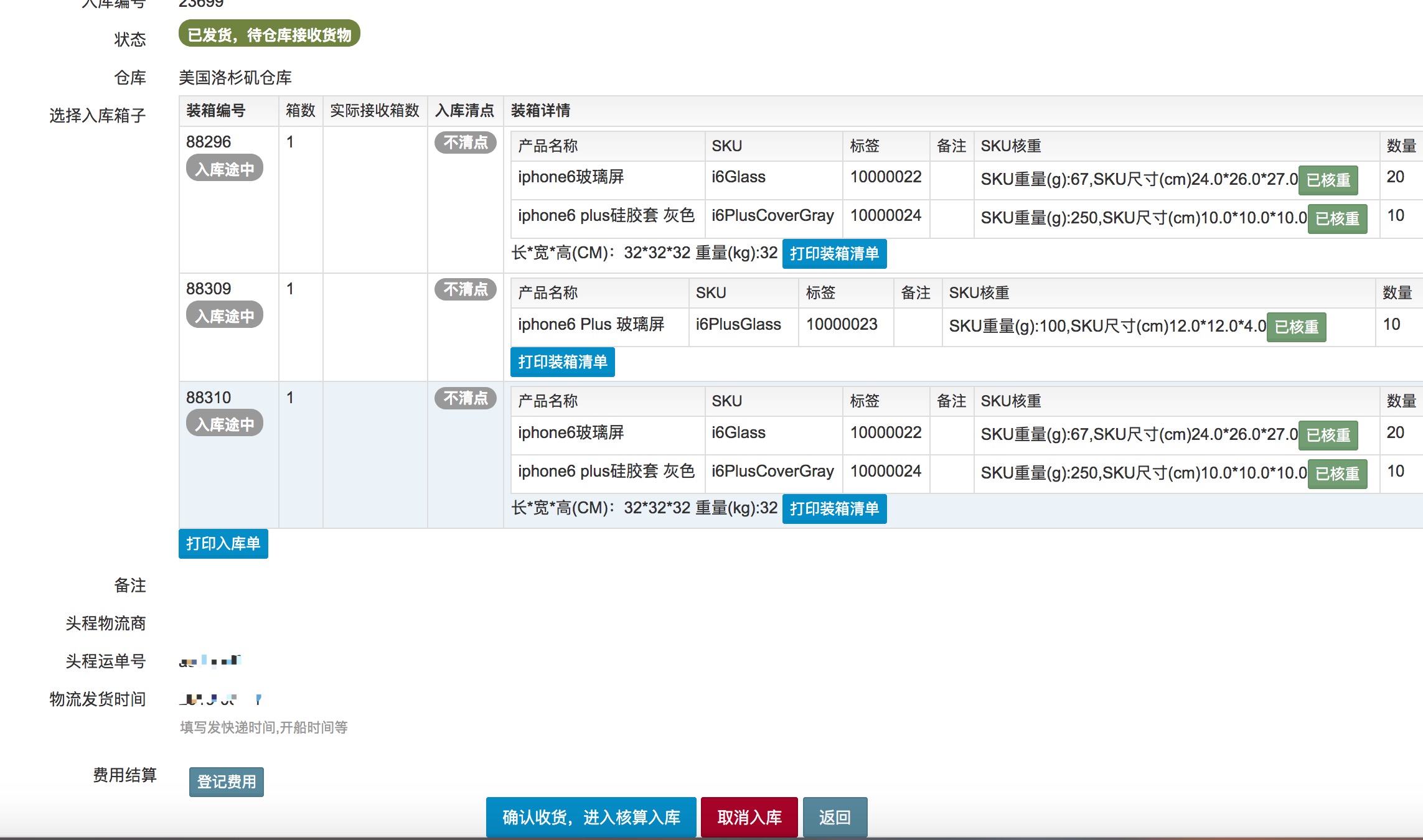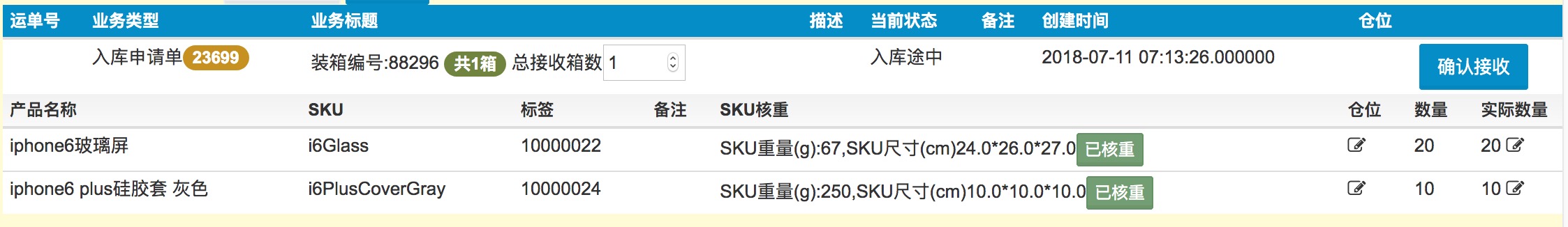 在系统顶部查询框扫描装箱外箱标,系统查询出该装箱信息,可完成SKU核重,SKU数量编号,箱数编辑,仓位编辑处理。装箱同样需要分两步即先接收再确认核算入库。